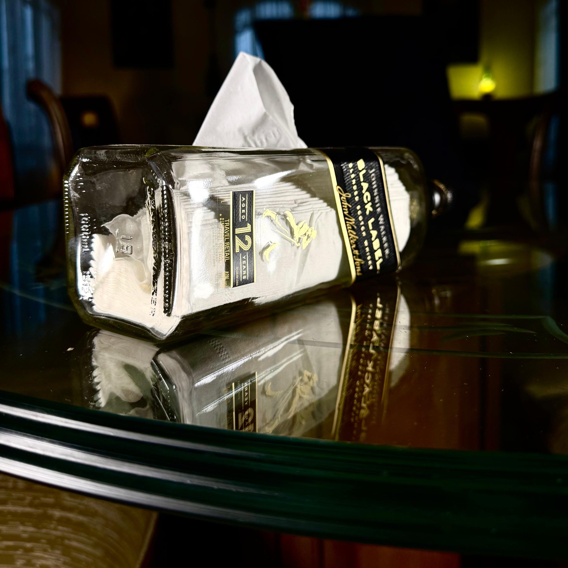 A Black Label Whiskey bottle transformed into tissue holder that turns everyday essentials into bar-cart décor. The glass-look vessel and matte-black label deliver a moody lounge vibe, while the angled opening keeps tissues easy to reach and display-ready on any counter or bar shelf.